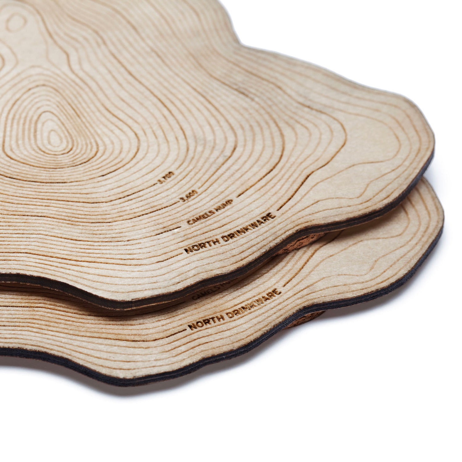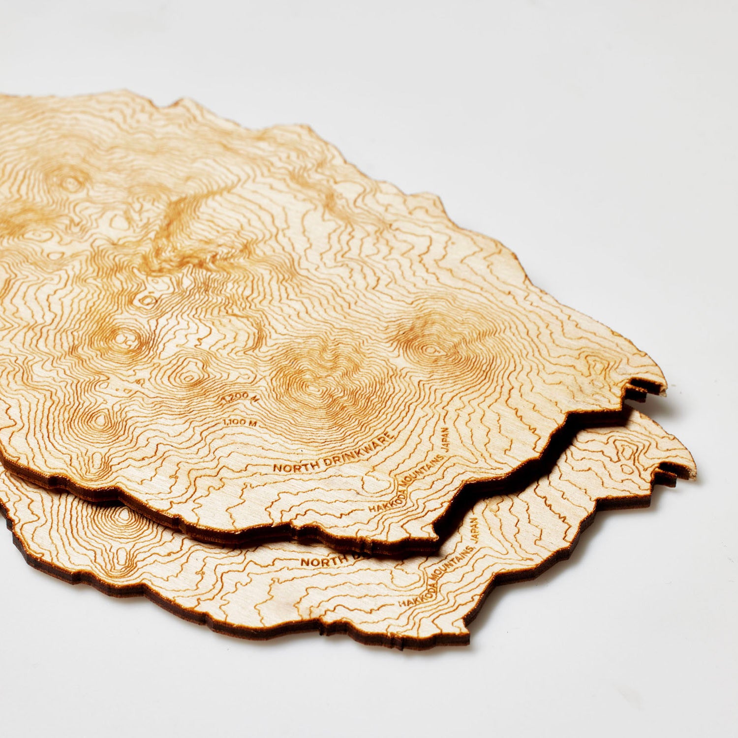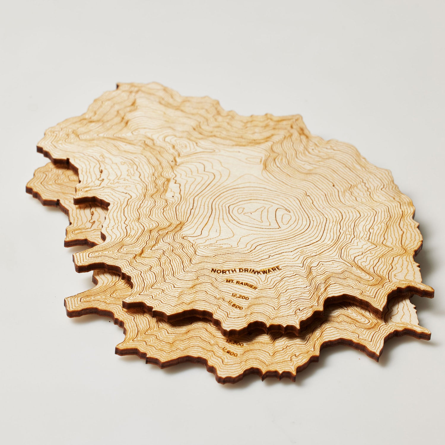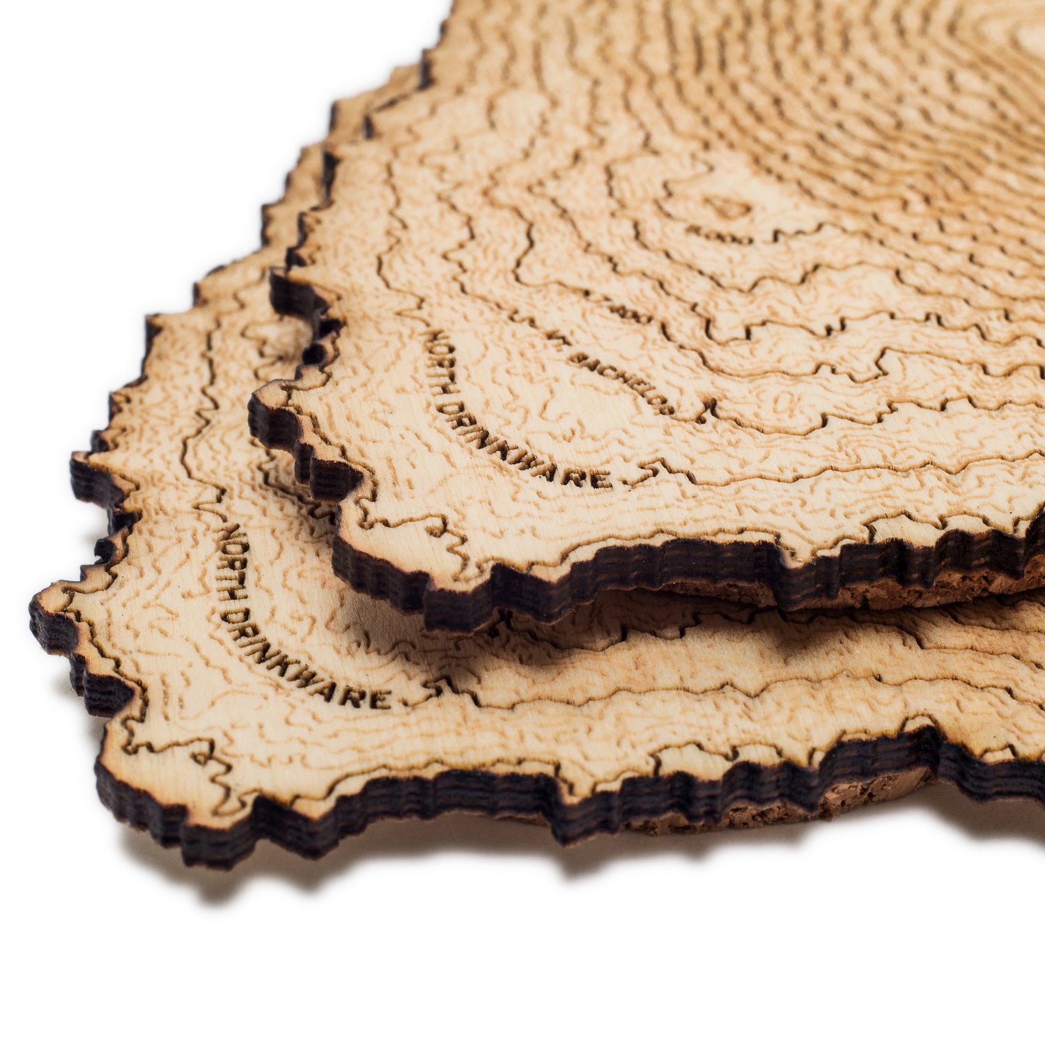 山々からインスピレーションを得た、特注のコースター。裏面にコルクを使用した made in USA。