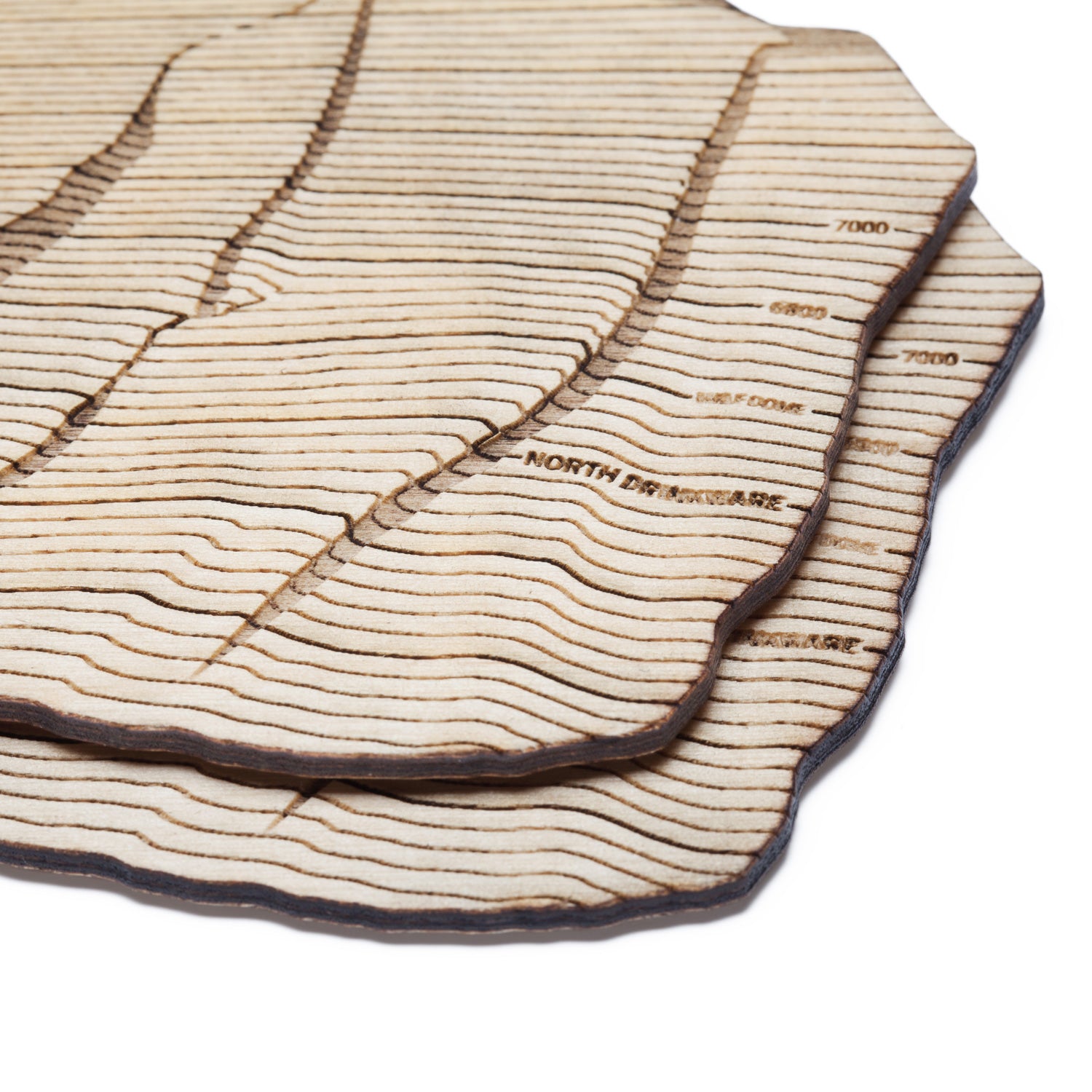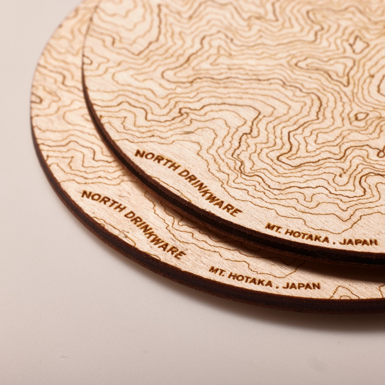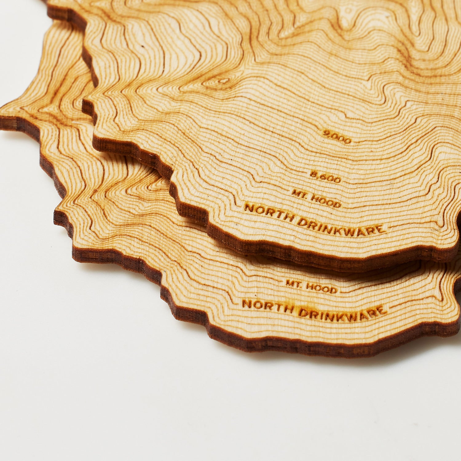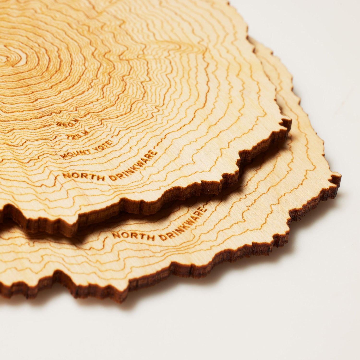 山々からインスピレーションを得た、特注のコースター。裏面にコルクを使用した made in USA。